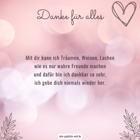Es gibt viele Momente im Leben, an dem man einem besonderen Menschen Danke sagen möchte. Sei es ein Dank für die Hilfe und Unterstützung oder ein liebevolles Dankeschön, dass es dich gibt. Meist fehlen einem die richtigen Texte, um seine Gefühle auszudrücken. Genau für diesen Moment findest du bei uns viele liebevolle Danke-Sprüche, mit denen du deiner Dankbarkeit Ausdruck verleihen kannst.